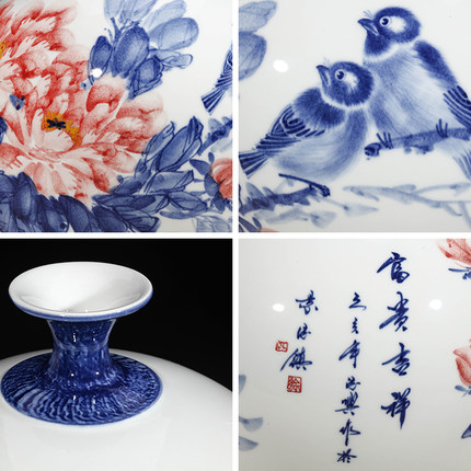 Designer hand painted blue and white ceramic vase with birds and flowers china